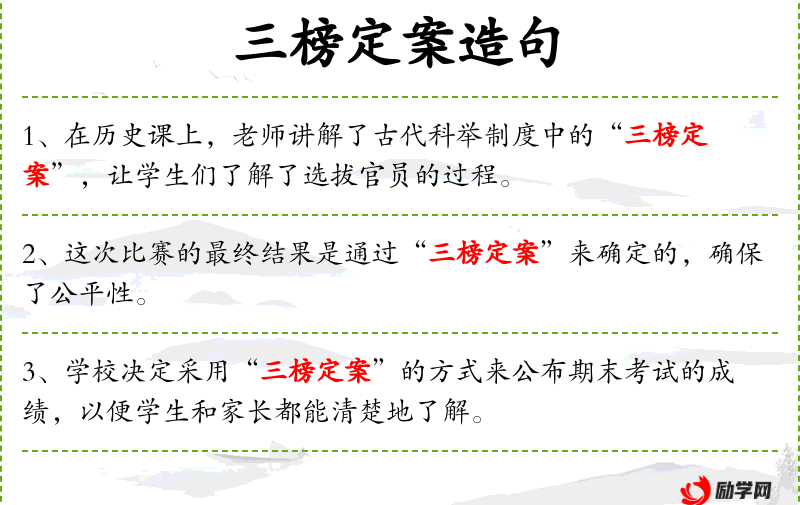 - 特定情境:这个句子描述了一个学校在特定情境下采取的措施,即通过“三榜定案”的方式公布期末考试成绩。