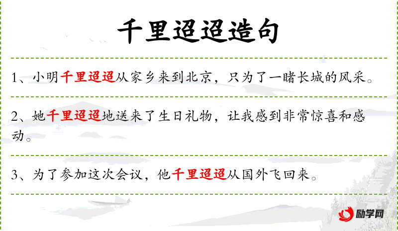 - 千里迢迢:形容路途遥远,同义词有“长途跋涉”、“远道而来”。