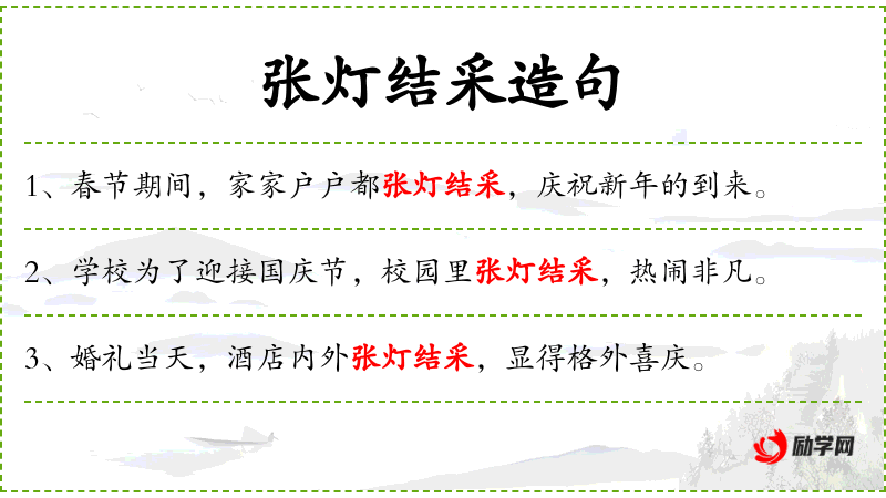 - 谓语:“张灯结采”和“欢聚一堂”。
