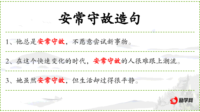 2. 【安常守故】 习惯于日常的平稳生活,保守旧的一套。指守旧不知变革。