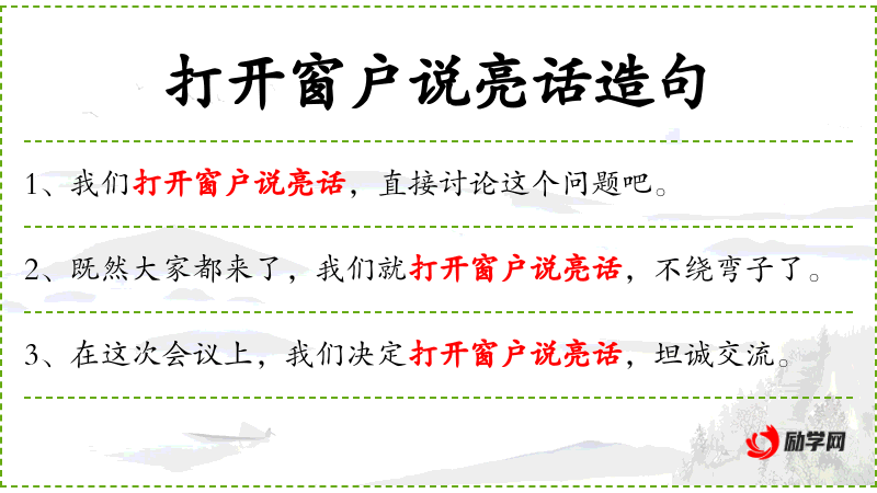 - 打开窗户说亮话:直译为“speak frankly”,意指坦率地说话。