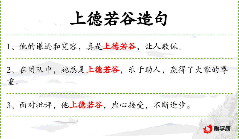 1. 【上德若谷】 - 上德:最高的道德;谷:溪谷。形容具有崇高道德的人胸怀如同山谷一样深广,可以容纳一切。