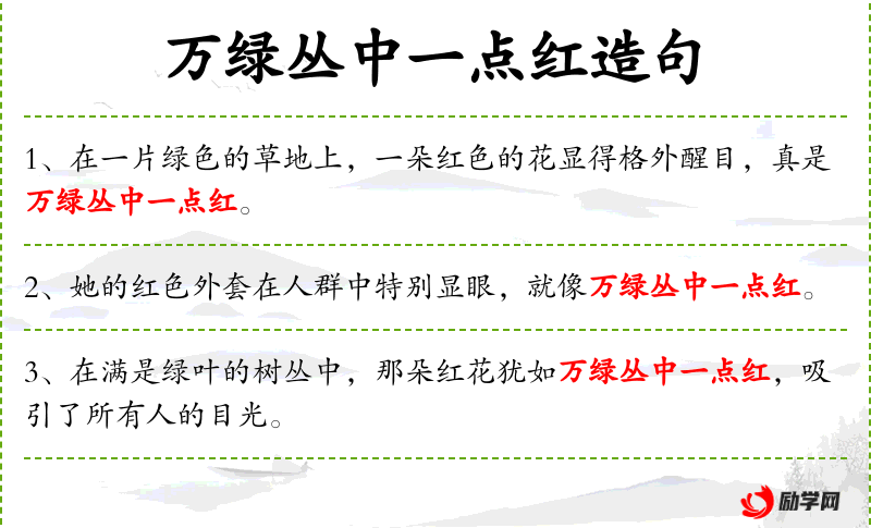 1. 【万绿丛中一点红】 - 大片绿叶丛中有一朵红花非常醒目。比喻在众多事物中突出最精采的一点,足以引起人们的注意。