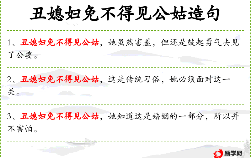 句子:“丑媳妇免不得见公姑,她虽然外表不出众,但内心却非常美丽。”