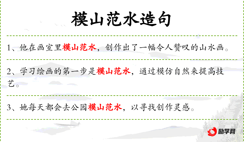 1. 【模山范水】 - 用文字或图画描绘山水景物。