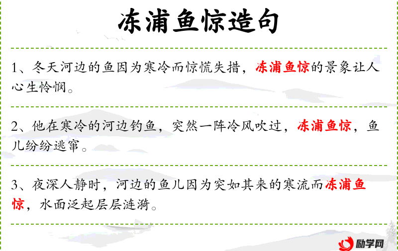 - 冻浦鱼惊:这个成语源自**古代文学,形象地描述了鱼儿因寒冷而惊慌失措的情景。
