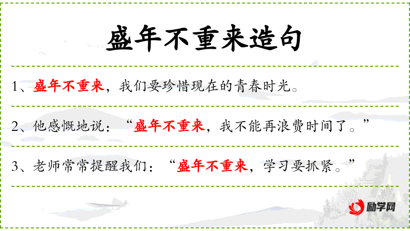 5. 【盛年不重来】 盛年:壮年;重:重新。指要珍惜壮年的大好时光。