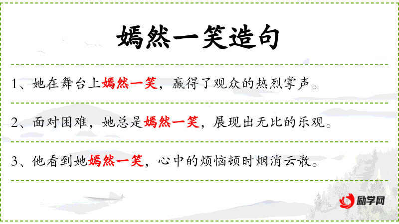 - 嫣然一笑:形容女子微笑的美丽样子,常用来形容女性的温柔和魅力。
