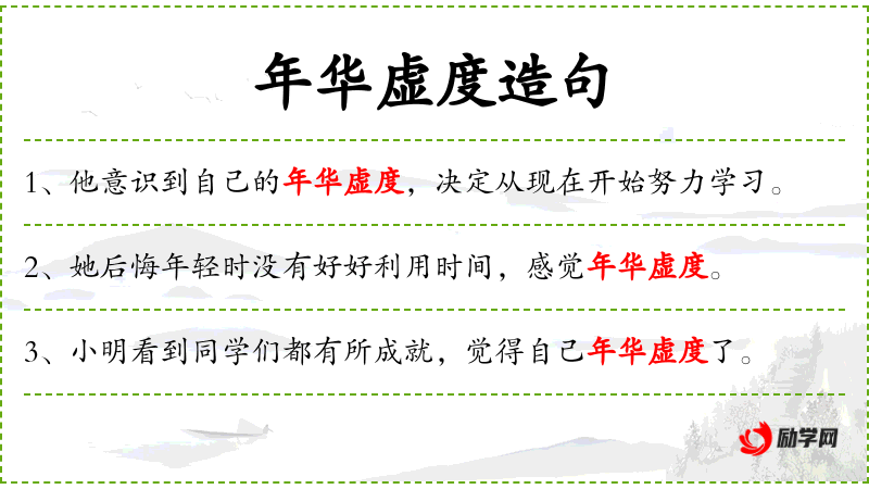 - 年华虚度:名词短语,表示时间被浪费,没有有效利用。