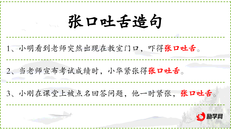 - 张口吐舌:opened her mouth and stuck out her tongue, 口を開けて舌を出した, ihr Maul öffnete und ihre Zunge herausstreckte