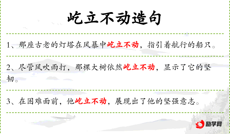 4. 【屹立不动】 像山峰一般高耸而稳固地立在原地不动。比喻立场或态度坚定,不可动摇。