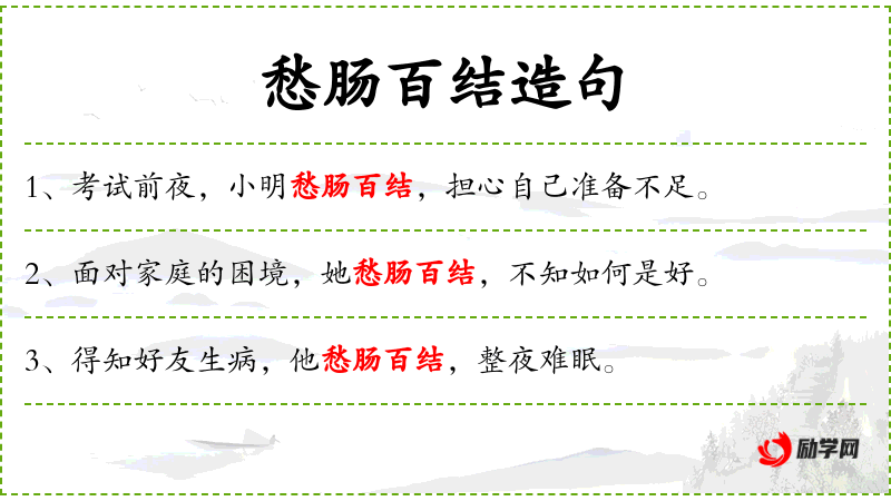 句子中的“愁肠百结”是一个成语,源自古代文学,用以形容人的内心极度忧愁。这个成语体现了文化中对情感细腻描绘的传统。