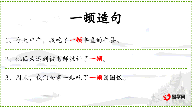 1. 【一顿】 - 一停;稍微休息; 表数量。用于吃饭﹑打骂﹑说话等,犹言一次,一回; 一起;一下子。