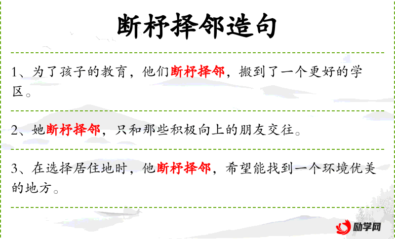 - 断杼择邻:这个成语源自《左传·僖公二十五年》,原文是“断织择邻”,后来演变为“断杼择邻”,强调了环境对人的重要性。