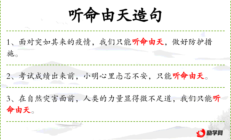 1. 【听命由天】 听:任凭;由:顺随。听任事态自然发展变化,不做主观努力。