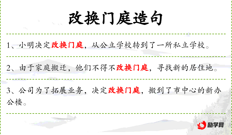 - 改换门庭:比喻改变工作或生活环境。