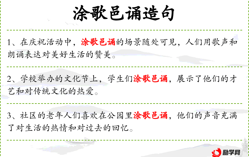 5. 【涂歌邑诵】 路途邑里的人全都歌诵。形容国泰民安、百姓欢乐的景象。
