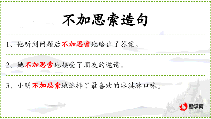 - 不加思索地:副词短语,表示动作迅速且没有经过深思熟虑。