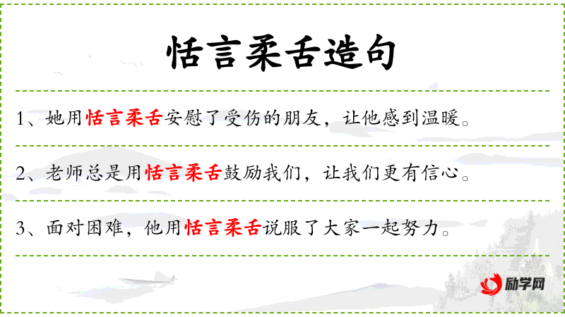 - 恬言柔舌:形容说话温和、委婉,善于说服。