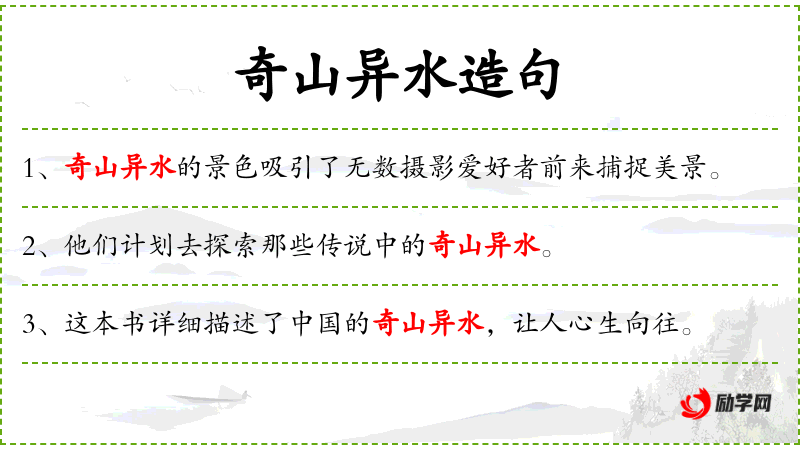 - **的奇山异水:指**特有的、美丽而独特的自然景观。