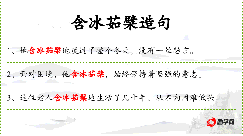 - 含冰茹檗:这个成语源自**古代,意指忍受极度的寒冷和苦楚,比喻人在困境中坚韧不拔。