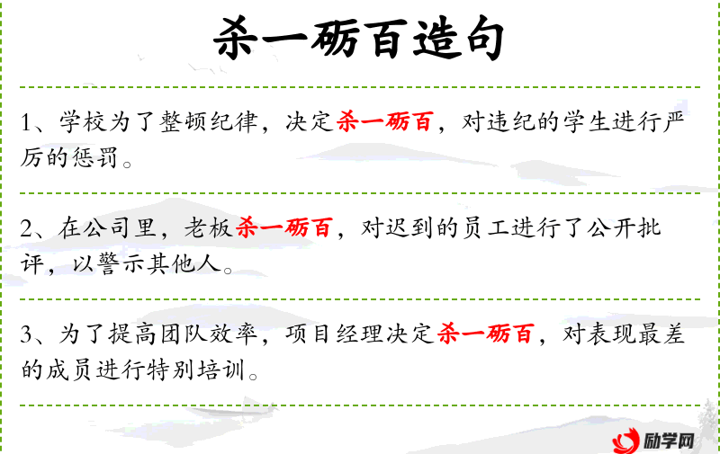 6. 【杀一砺百】 犹言杀一儆百。处死一个人,借以警戒许多人。
