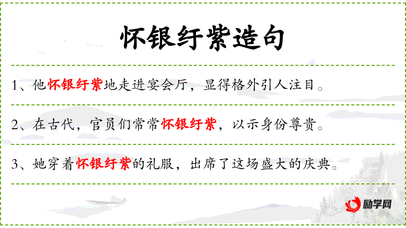 1. 【怀银纡紫】 指显贵。银,银印;紫,紫绶。汉制,相国、丞相、太尉、公侯皆紫绶;秩二千石皆银印。