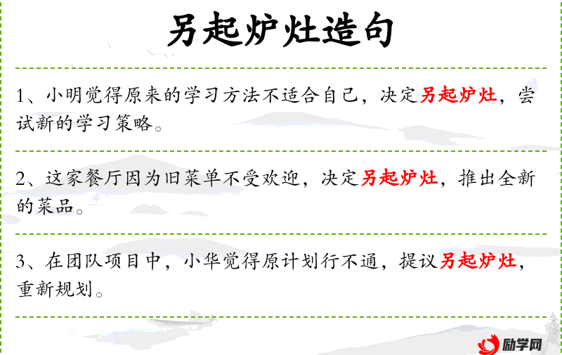 - 另起炉灶:成语,意为重新开始或采取新的方法。