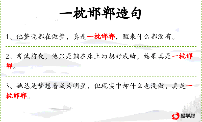 1. 【一枕邯郸】 - 比喻虚幻的梦想。同“一枕黄粱”。