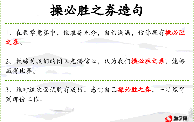 - “操必胜之券”带有一定的自信和乐观,但也可能被解读为过于自信或傲慢。