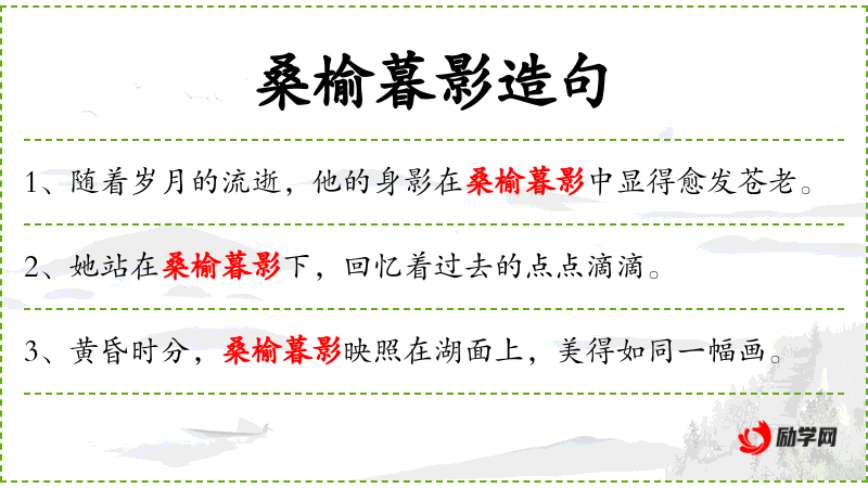 4. 【桑榆暮影】 - 桑榆;夕阳余光所在的地方。夕阳斜照桑榆树的黄昏景象,指傍晚。比喻垂老之年。