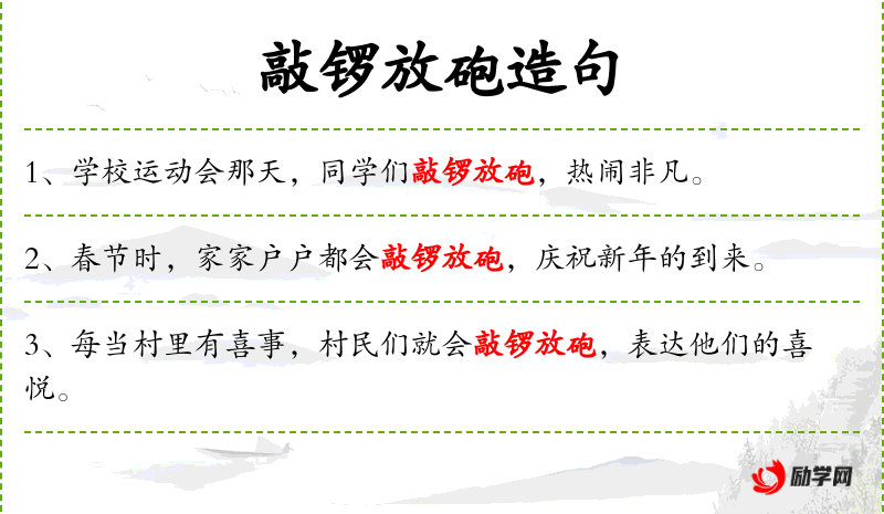 - “**会当天,同学们通过敲锣和放砲,营造了一个非常热闹的氛围。”
