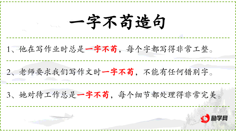 - 一字不苟:成语,形容写字或做事非常认真,不马虎。