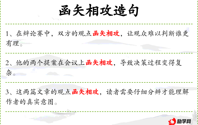 句子:“在辩论赛中,双方的观点函矢相攻,让观众难以判断谁更有理。”
