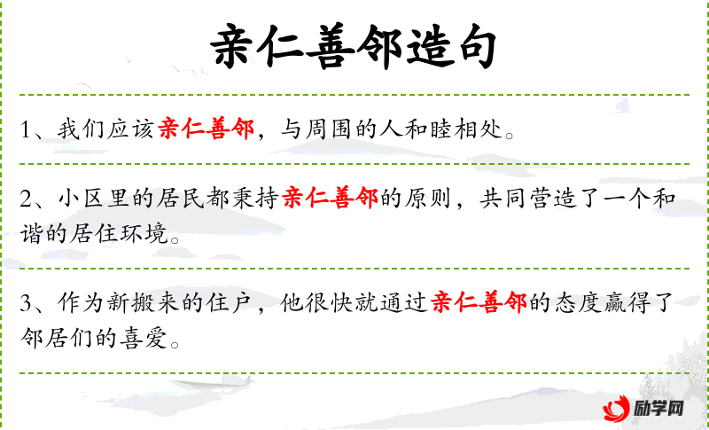 - 亲仁善邻:亲近有仁德的人,善待邻居。这里的“亲”和“善”都是动词,表示亲近和善待。