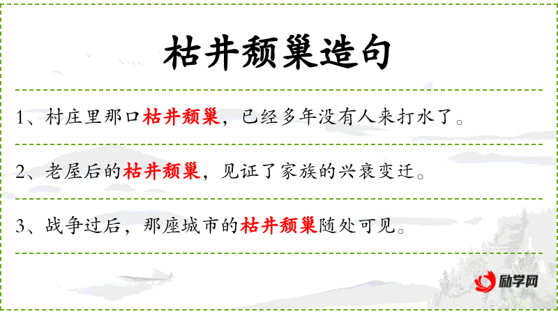 3. 【枯井颓巢】 - 枯:没有水;颓:坍塌。干枯的水井,坍塌的鸟窝。形容荒凉遭受破坏的样子。