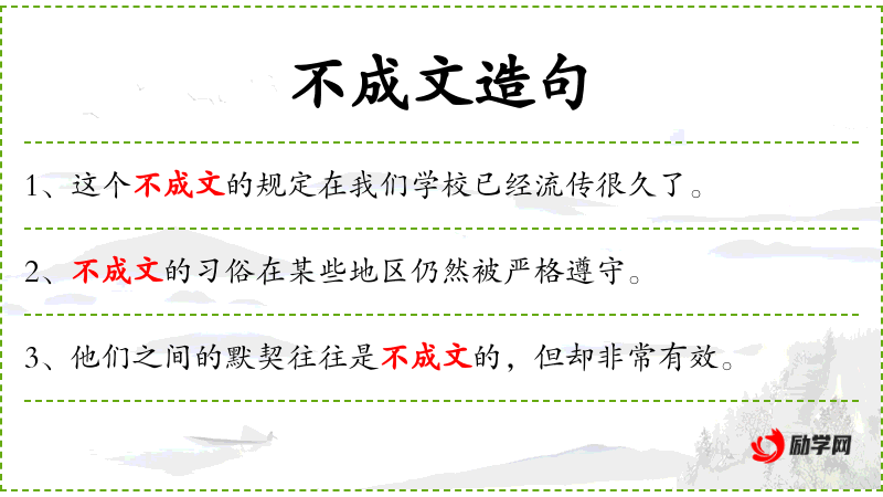 1. 【不成文】 属性词。没有用文字固定下来的:~的规矩|多年的老传统~地沿袭了下来。