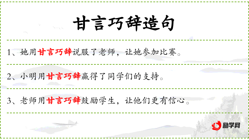 1. 【甘言巧辞】 - 甘言:甜美动听的语言;巧辞:逢迎讨好的言辞。甜美动听的逢迎之辞。