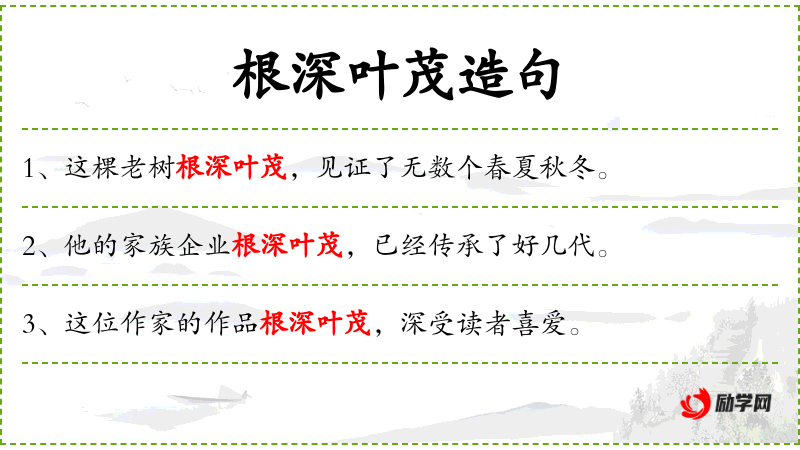 3. 【根深叶茂】 茂:繁茂。根扎得深,叶子就茂盛。比喻基础牢固,就会兴旺发展。