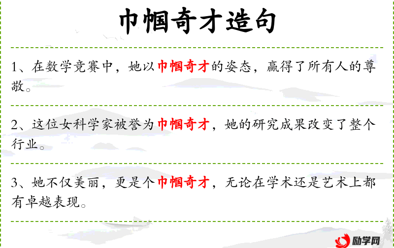 巾帼奇才:这个成语源自**古代,巾帼指女性,奇才指非凡的才能。这个成语强调了女性在政治或其他领域中的杰出表现。