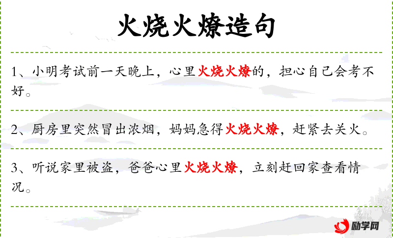 1. 【火烧火燎】 - 燎:烧。被火烧烤。比喻心里非常着急或身上热得难受。