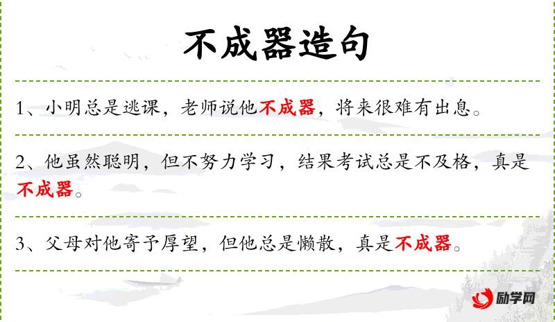 - 不成器:成语,表示不能成为有用的人或不能成功。