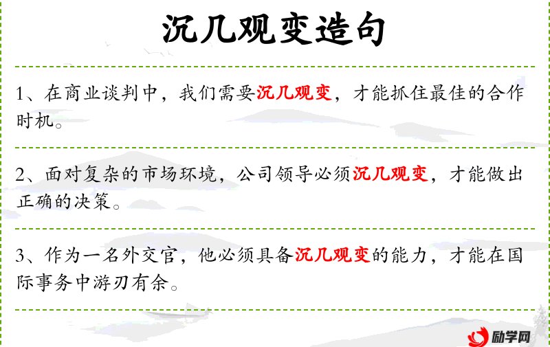 1. 【沉几观变】 - 沉:沉着;几:事物变化前的前兆。冷静观察事物,随机应变。