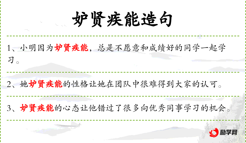 句子:“小明因为妒贤疾能,总是不愿意和成绩好的同学一起学*。”