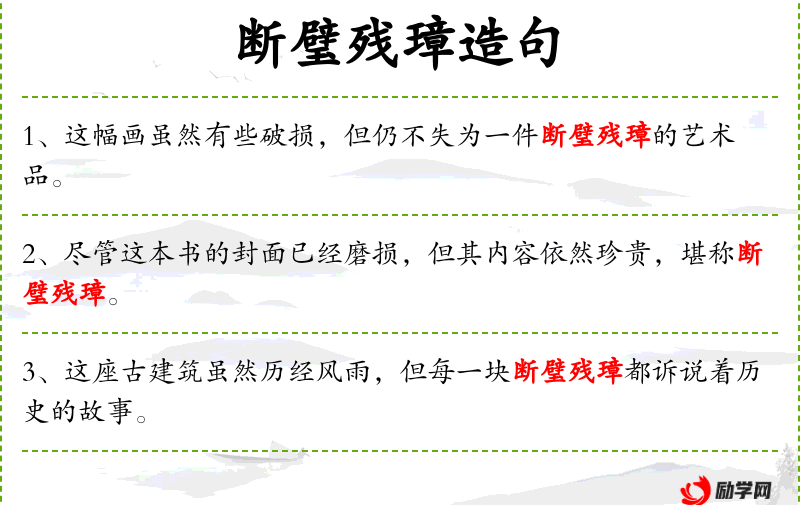 - 断璧残璋:这个成语源自**古代,形容残缺不全但仍珍贵的物品。在艺术领域,它常用来形容那些虽然有损坏但仍具有极高艺术价值的作品。