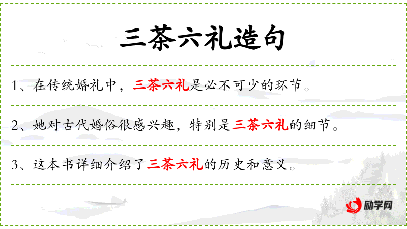 1. 【三茶六礼】 - 犹言明媒正娶。旧指正式婚姻。