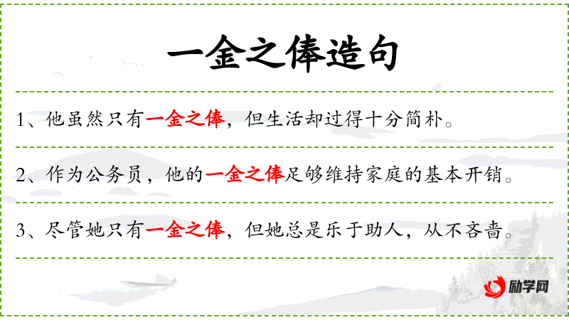 1. 【一金之俸】 - 一:比喻很少;金:金钱;俸:俸禄。很少的一点薪俸。比喻微薄的待遇。