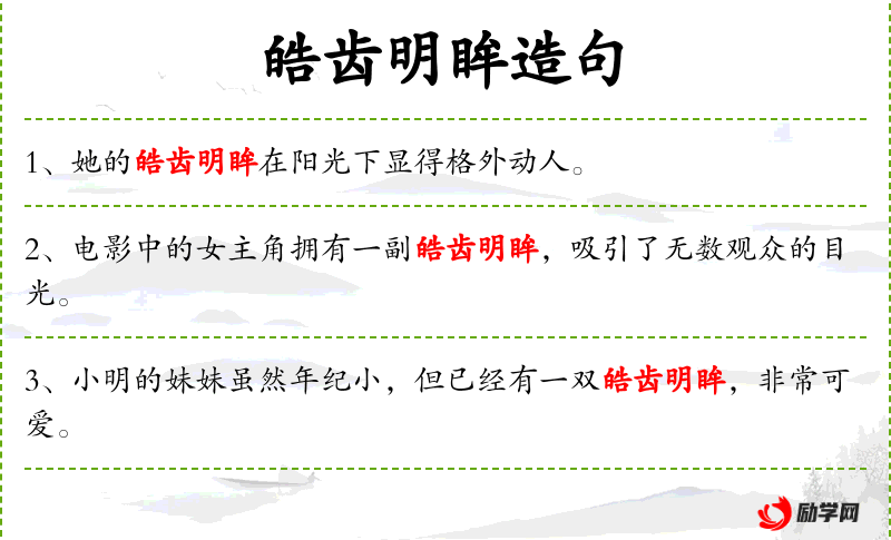 2. 【皓齿明眸】 - 皓:白色的样子;眸:眼珠,泛指眼睛。洁白的牙齿,明亮的眼睛。形容女子容貌美丽,亦喻指美女。
