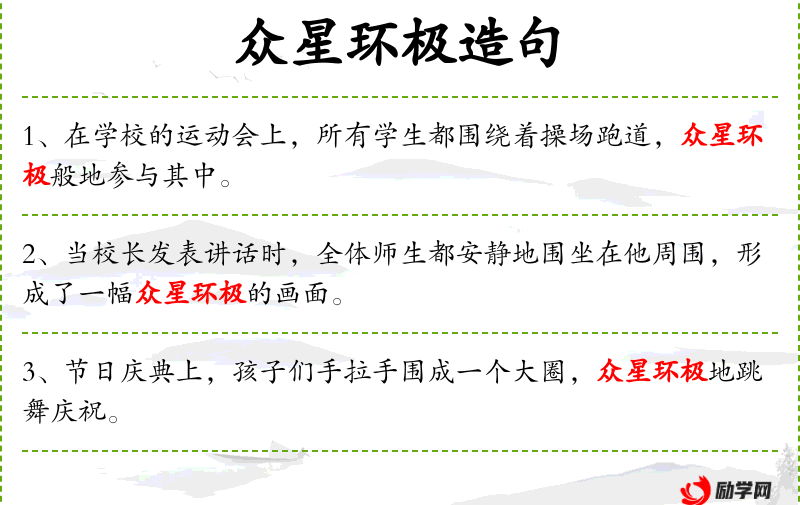 1. 【众星环极】 比喻众物围绕一物或众人拥戴一人。