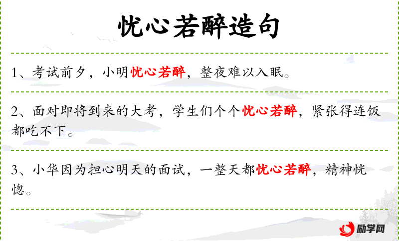 1. 【忧心若醉】 忧愁痛苦的情态就像喝醉了酒一样。